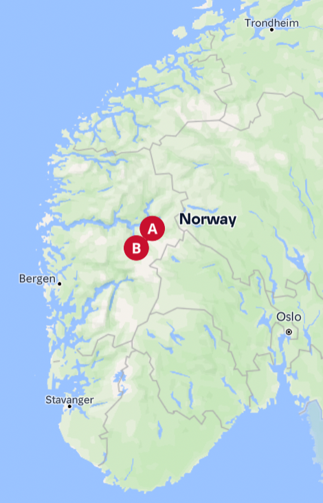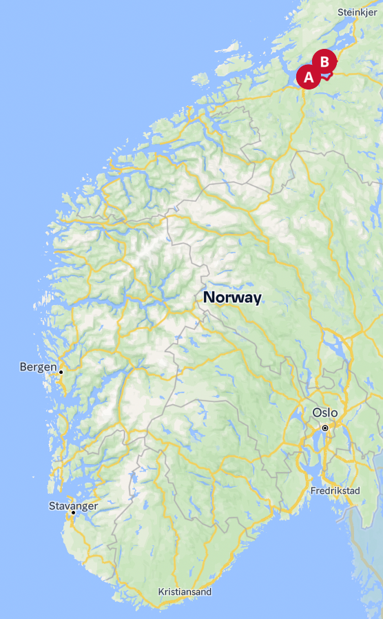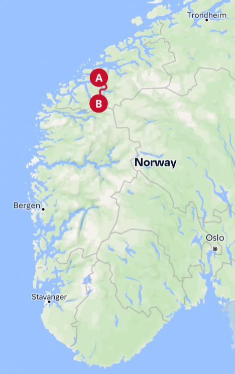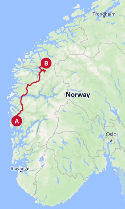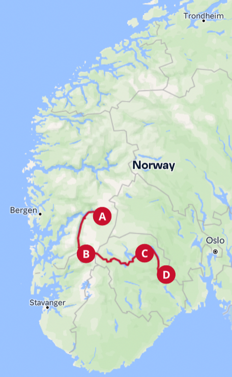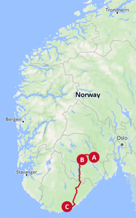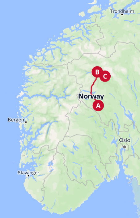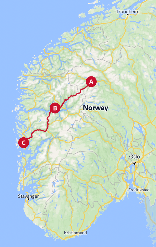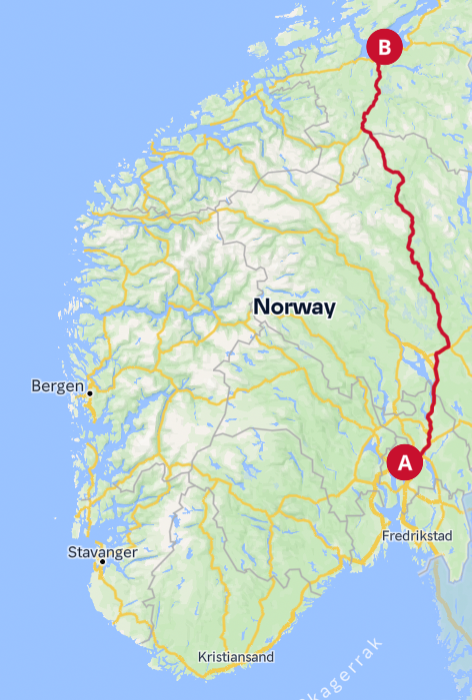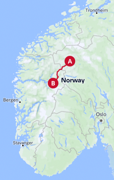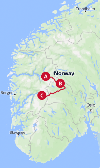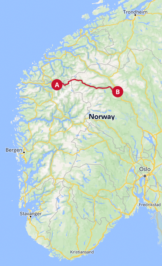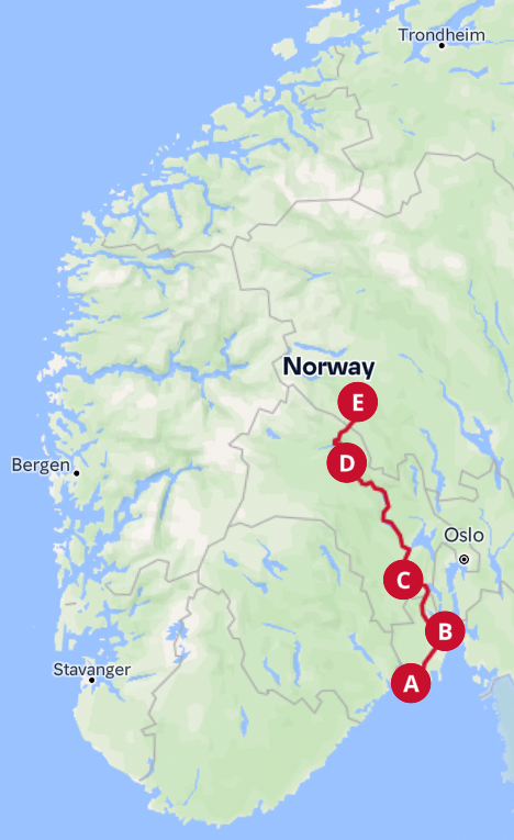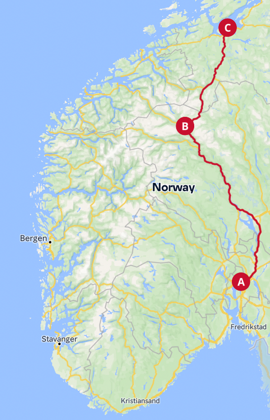 - Oslo - Trondheim (E6/Rv3) -